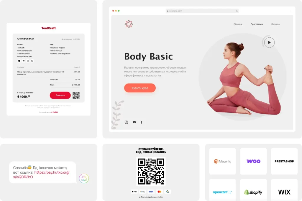 Онлайн-инвойс, платежная ссылка, кнопка оплаты, платежный QR-код, готовые интеграции с CMS и конструкторами сайтов – все для старта без технических сложностей.