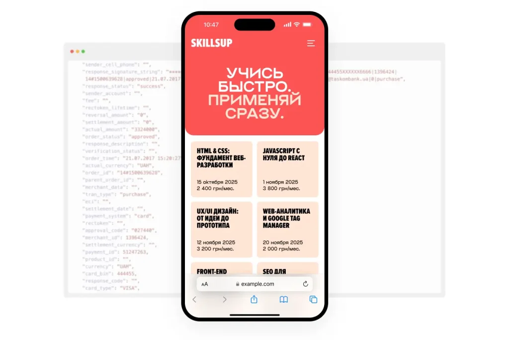 Как только пользователь выбрал нужный для себя онлайн-курс или другой образовательный продукт, он автоматически попадает на платежную страницу hutko для оплатыПроцесс зависит от способа интеграции. Именно она заботится о комфорте покупателей и высокой конверсии. А еще ее можно кастомизировать под стилистику вашего бренда и сделать неотъемлемым элементом воронки продаж.