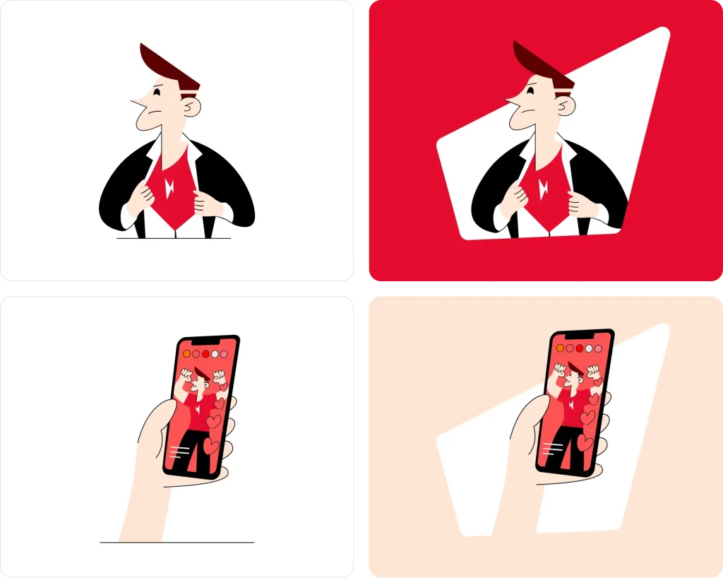 Будуйте ілюстрації навколо чітких і лаконічних сцен, які зчитуються з першого погляду. Передавайте через них конкретні дії, стани або взаємодії з сервісом, щоб підсилити ключову думку. Уникайте другорядних деталей і візуального шуму – сюжет має працювати на ідею, а не відволікати від неї.