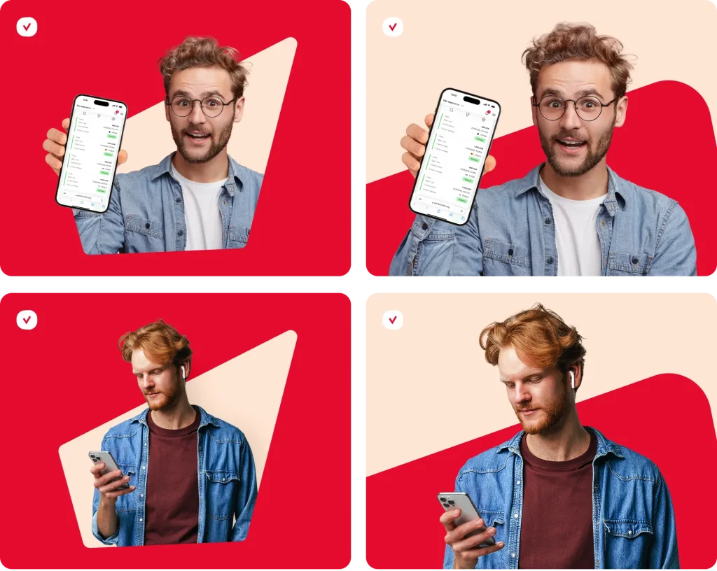 Демонструйте продукт, його переваги чи інтерфейси через екрани гаджетів у поєднанні з живими фото людей. Зображення при цьому повинні залишатися природними та відповідати принципам динаміки, перспективи й емоційності, визначеним для бренду.