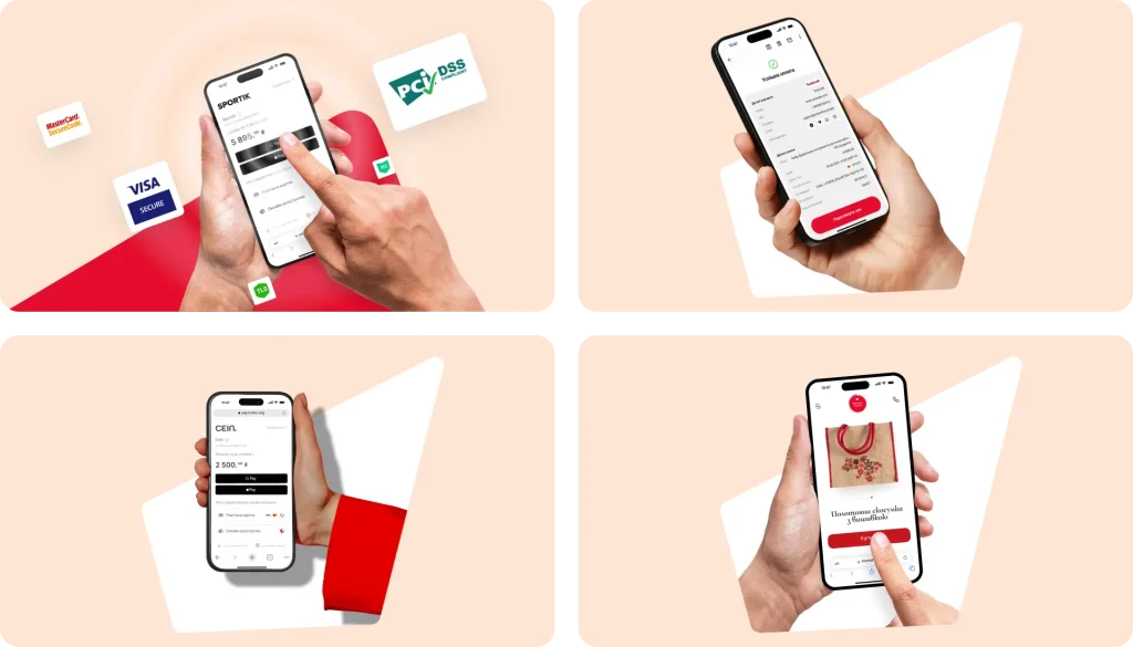 Застосовуйте зібрані нижче зображення для демонстрації взаємодії з сервісом у момент розрахунку. Важливо, щоб у фокусі залишався сам процес і інтерфейс, а дія виглядала простою та інтуїтивною. Такі ілюстрації найкраще використовувати в ситуаціях, коли потрібно показати легкість оплати і відчуття контролю з боку користувача.
