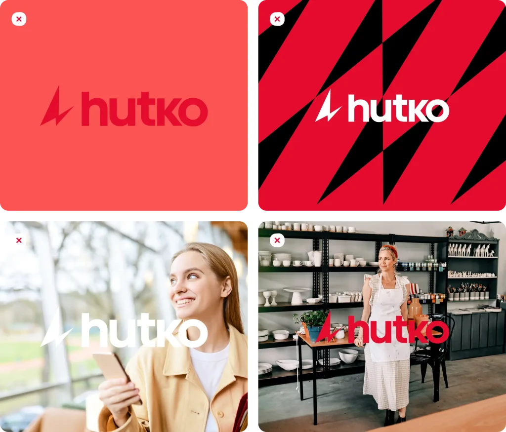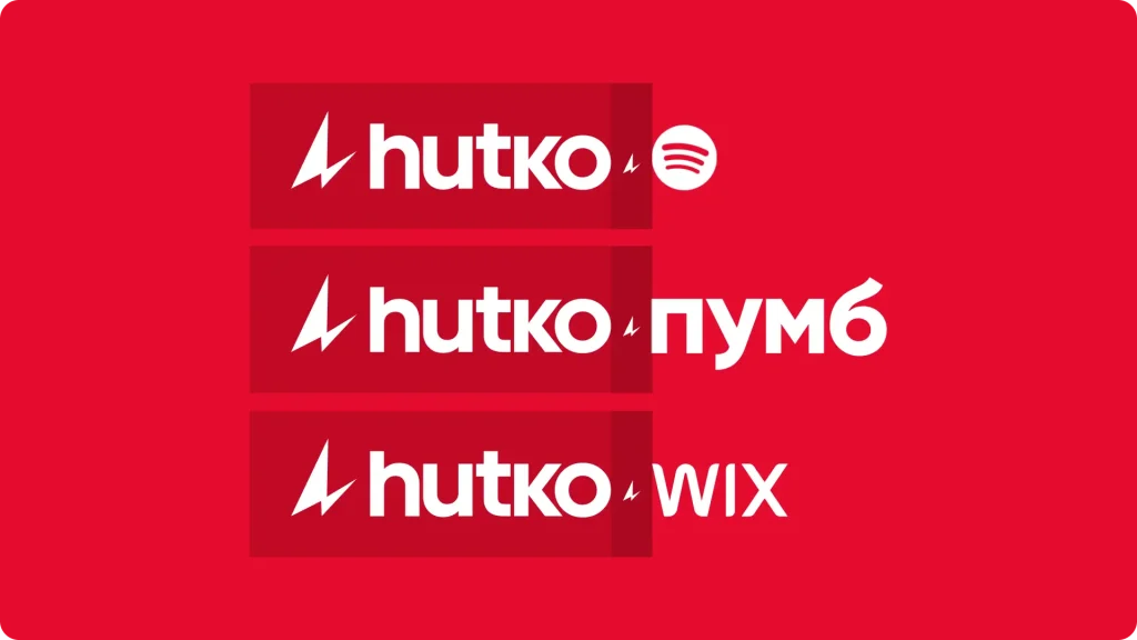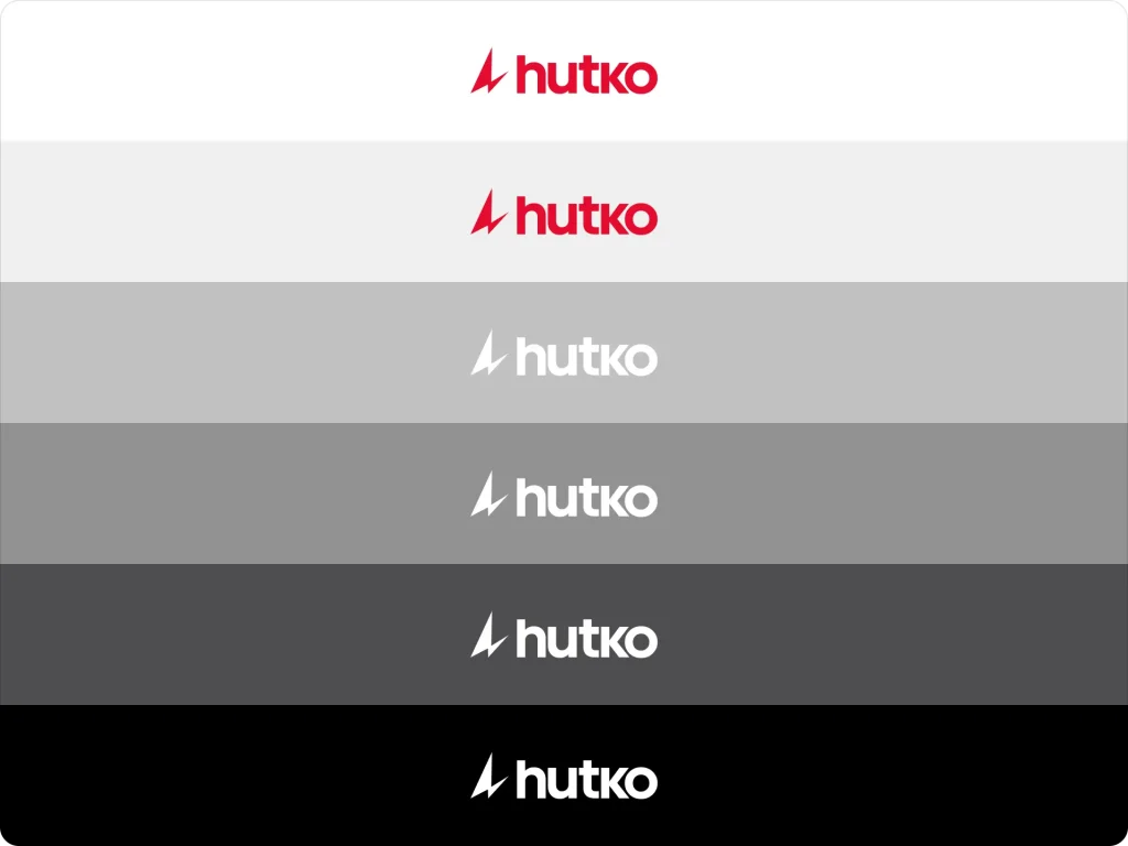 Логотип існує у кольорах hutko white, hutko red та hutko black. Оберіть той варіант, який у поєднанні з іншими елементами дизайну буде максимально контрастним і чітким. Так, для світлого фону найкраще підійде hutko red або hutko black, для темного – hutko white. На фотографіях можна використовувати hutko white або hutko red, але переконайтеся, що логотип чіткий і читабельний.