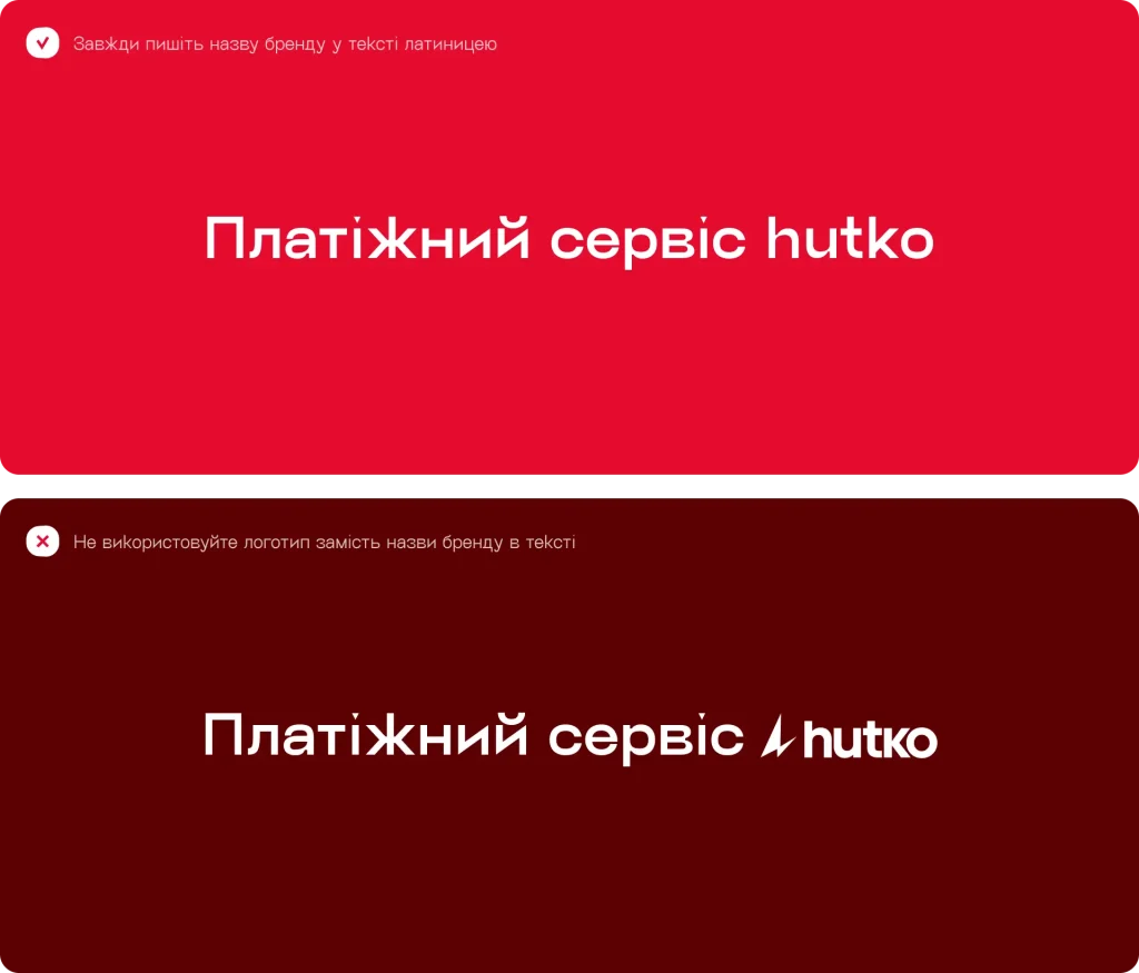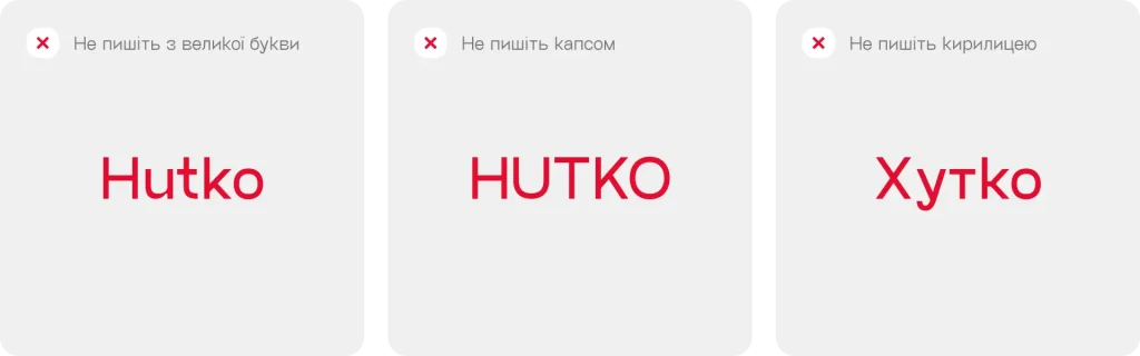 Пишіть назву бренду тільки латиницею з малої літери та без лапок. Такий формат підкреслює впізнаваність бренду, зберігає його ідентичність і допомагає уникнути помилкового читання. Якщо речення починається зі слова hutko, назва все одно має бути з малої літери. Щоб зберегти граматику, можна додати один із дескрипторів, наприклад «платіжний партнер», «бренд», «сервіс» тощо. Якщо слово «хутко» написане кирилицею, воно вже не є назвою бренду, а лише має загальноприйняте значення.