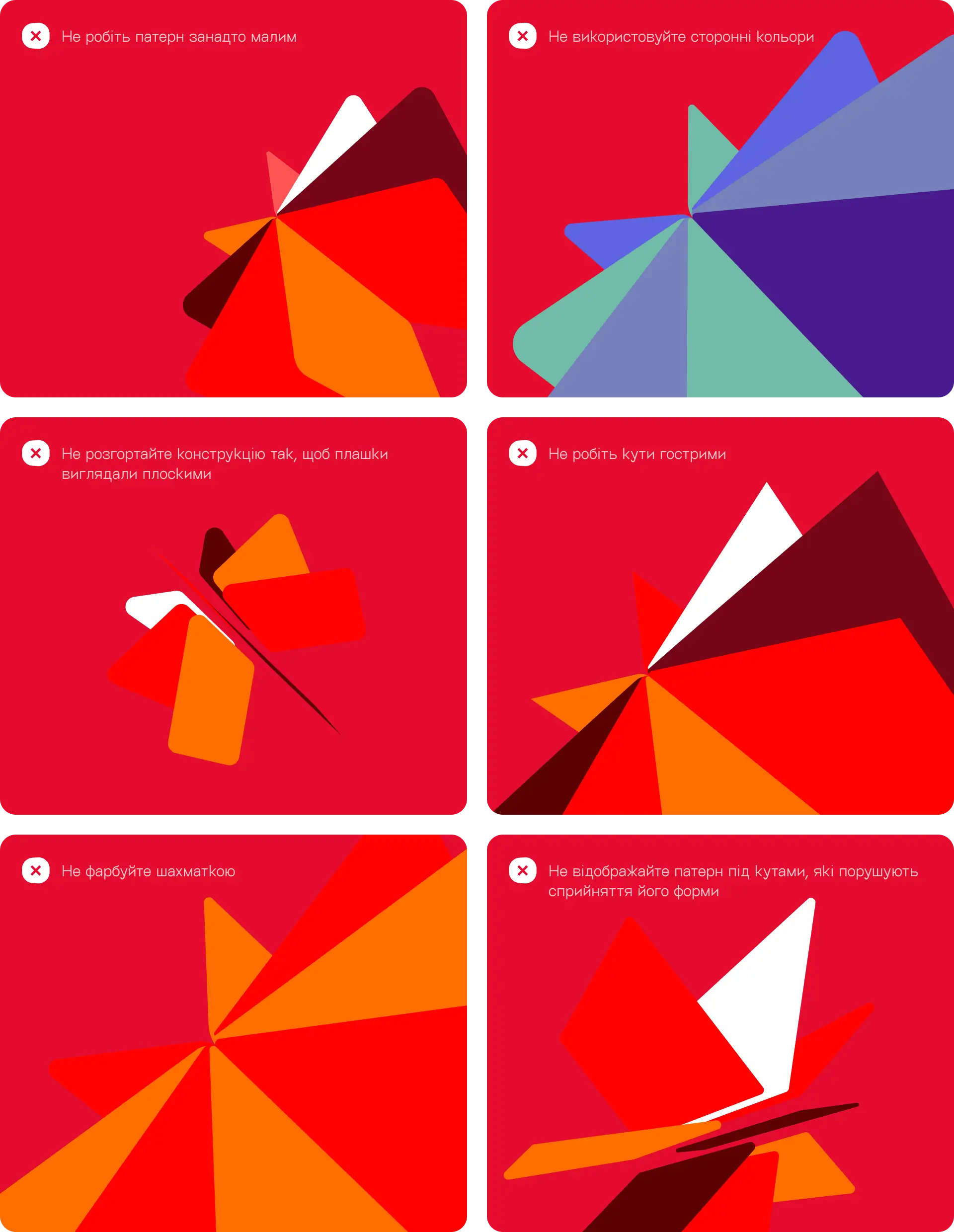 Наш патерн завжди є активною домінантою та створює відчуття динаміки та балансу. Він формує асиметричну композицію і спрямовує погляд користувача в певну точку, допомагаючи зосередити увагу на головному. Водночас його конструкція не має перешкоджати легкому зчитуванню елементів, розташованих поверх нього. Якщо макет мінімалістичний з одним масивним акцентом (наприклад, логотип або короткий слоган), розтягуйте візерунок на щонайбільшу площину. Розміщення патерна ближче до краю зображення урівноважує всю композицію.