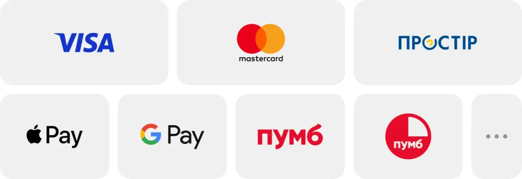 Картки Visa/Mastercard/Prostir + Apple Pay/Google Pay − обов’язково, також бажана розстрочка (оплата частинами).