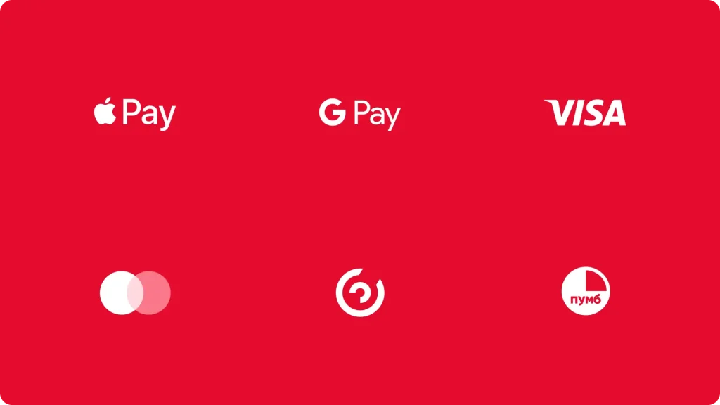 Розміщуйте іконки або логотипи без спотворень і зайвих ефектів, залишайте їм достатньо простору та використовуйте лише в тому вигляді, в якому вони представлені нижче. Пам’ятайте, що фірмові знаки платіжних методів працюють як підтвердження можливостей оплати, а не як декор.