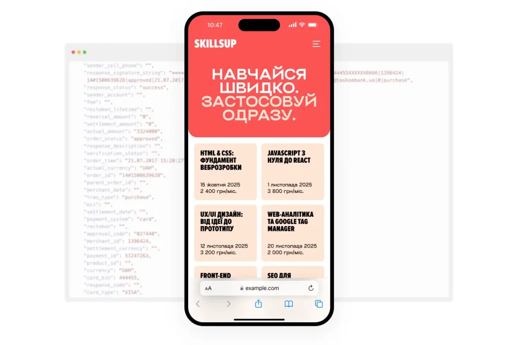 Щойно користувач обрав потрібний для себе онлайн-курс чи інший освітній продукт, він автоматично потрапляє на платіжну сторінку hutko для оплатиПроцес залежить від способу інтеграції. Саме вона дбає про комфорт покупців та високу конверсію. А ще її можна кастомізувати під стилістику вашого бренду та зробити невіддільним елементом воронки продажу.
